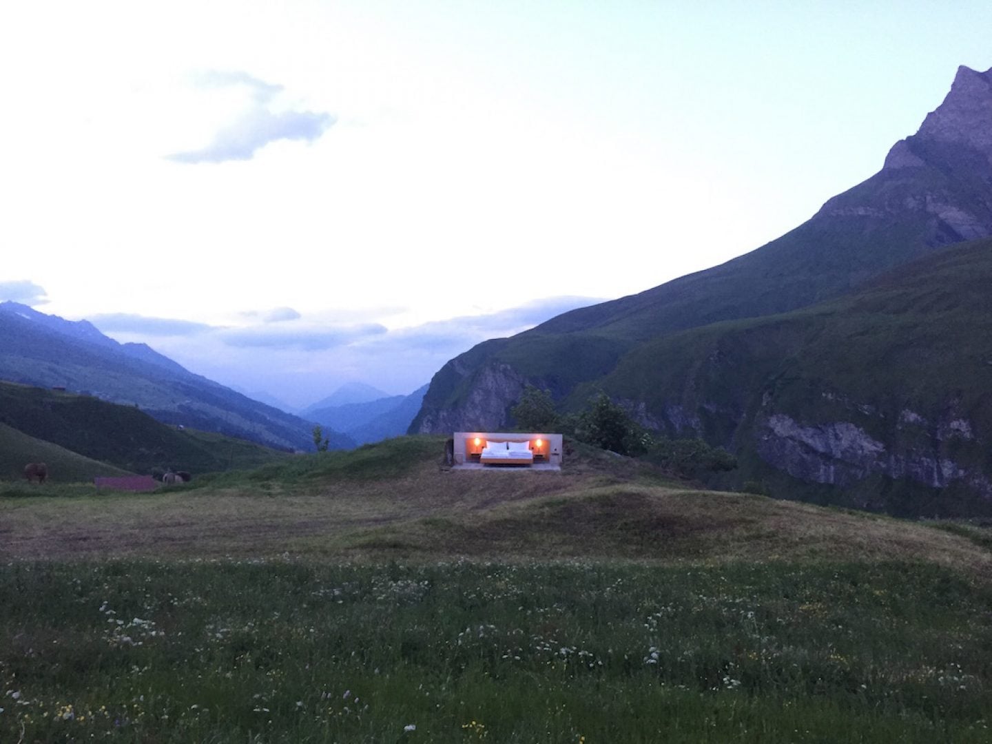 “Switzerland is the imaginary building of the new hotel”. The suite has no roof, walls or bathroom and is made up of only a double bed, side tables and a few lamps. The Riklin brothers explain, “The landscape of Switzerland is the imaginary building of the new Null Stern Hotel version.” The double bed is bookable throughout spring and autumn and costs 250 CHF per night.