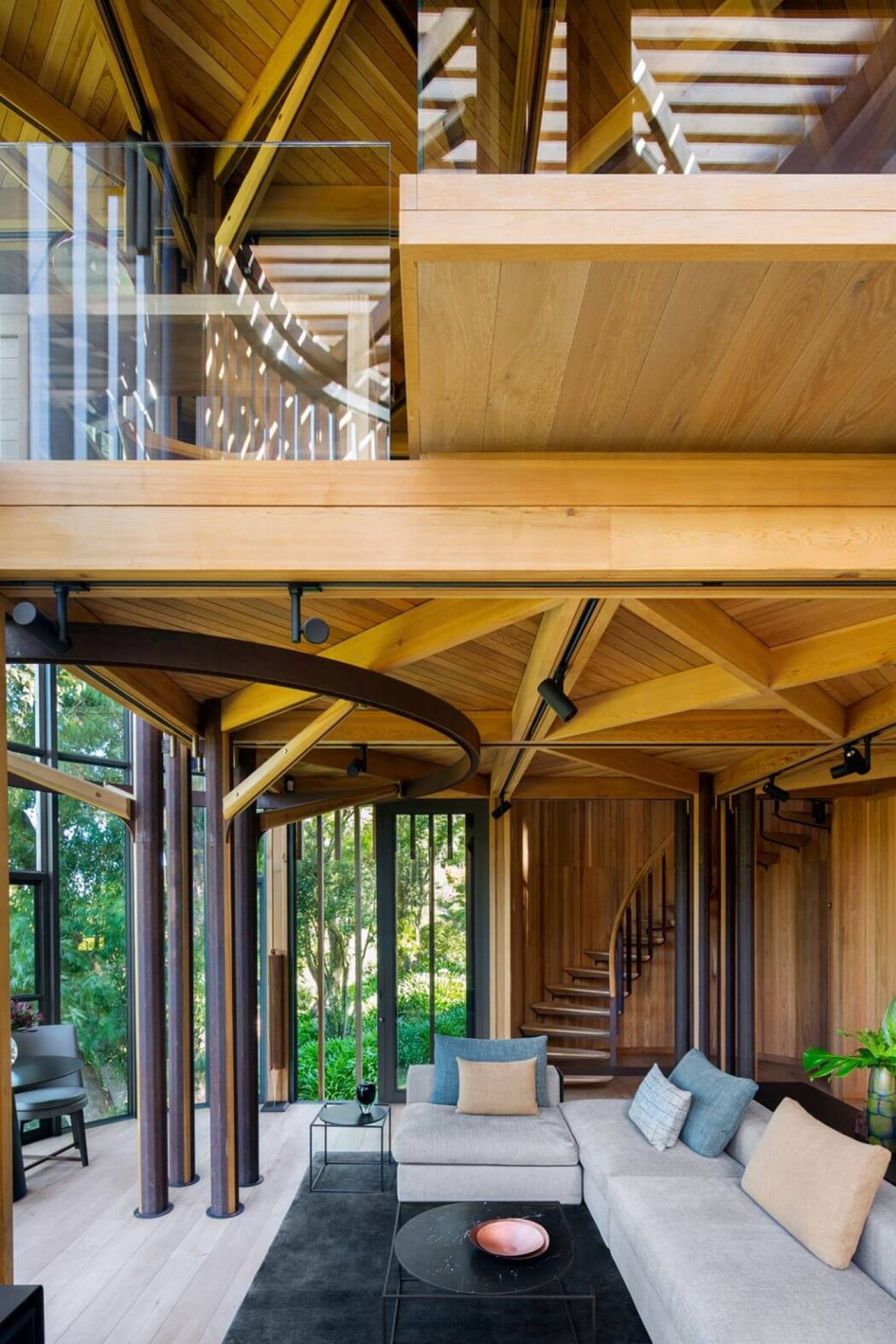 The structure is composed of four cylindrical wooden towers elevated on stilts, each offering large windows that allow the residents wonderful views over the surrounded forest. The architects designed the residence for a client who wanted their hide-away in the Constantia suburb of the South African capital that resembles a tree house of their childhood. Inside, contemporary furnishings fill the spaces, creating a nostalgic escape and a comfortable home at the same time. The main living area occupies the first floor of the house, featuring a patio, a dining alcove and the main staircase. A master bedroom with a glass balustrade is located on the second floor, offering views to the level at the front. The architects left all the materials untreated with the intention that they will weather naturally over time.