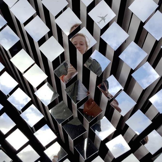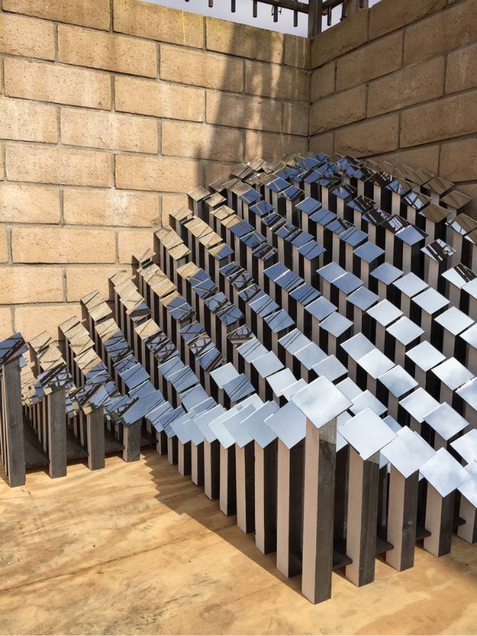 “Skyscape”- a site specific ephemeral installation consisting of pine timbers, mirrors and acrylic paint strategically placed at varying heights and angles, mimicking a topographic landscape. The piece introduces an organic atmospheric element against the urban/concrete surroundings in the downtown LA Arts District. The colors of the sky change throughout the course of the day of which the mood of the structure changes though light and dark contrasting tones depending on the viewer’s perspective. Guests of the installation can take a selfie in the sky. OPEN for humans is a design collaborative between an architect and an artist based in Los Angeles. We are always seeking collaborations with creative brands for experiential work.