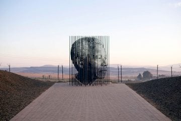South african artist Marco Cianfanelli has developed a memorial to recognize the 50 year anniversary of peace activist and politician Nelson Mandela’s capture by the apartheid police in 1962. Viewed in profile, Mandela’s noggin spans 50 steel columns measuring 6.5 and 9 meters high, anchored to the concrete-covered ground. The shape signifies the leader’s 27 years behind bars for his efforts to bring equal rights and governmental representation to the once racially divided nation. Cianfanelli’s perceptive rendering is located in Howick, a town located 90 kilometers south from the city of Durban in the countryside of the southernmost african country. The 50 columns represent the 50 years since Mandela’s capture, as well as solidarity. Becoming part of the surrounding landscape, the art object is affected by the changing light and atmosphere behind and around it. Made possible by the Department of Co-operative Government and Traditional Affairs (COGTA) the uMngeni Municipality, the Apartheid Museum and the KwaZulu Natal Heritage Council (AMAFA) in association with the Nelson Mandela Centre of Memory, this historic memorial site was inaugurated and unveiled on the 4th of August 2012 by President Jacob Zuma.