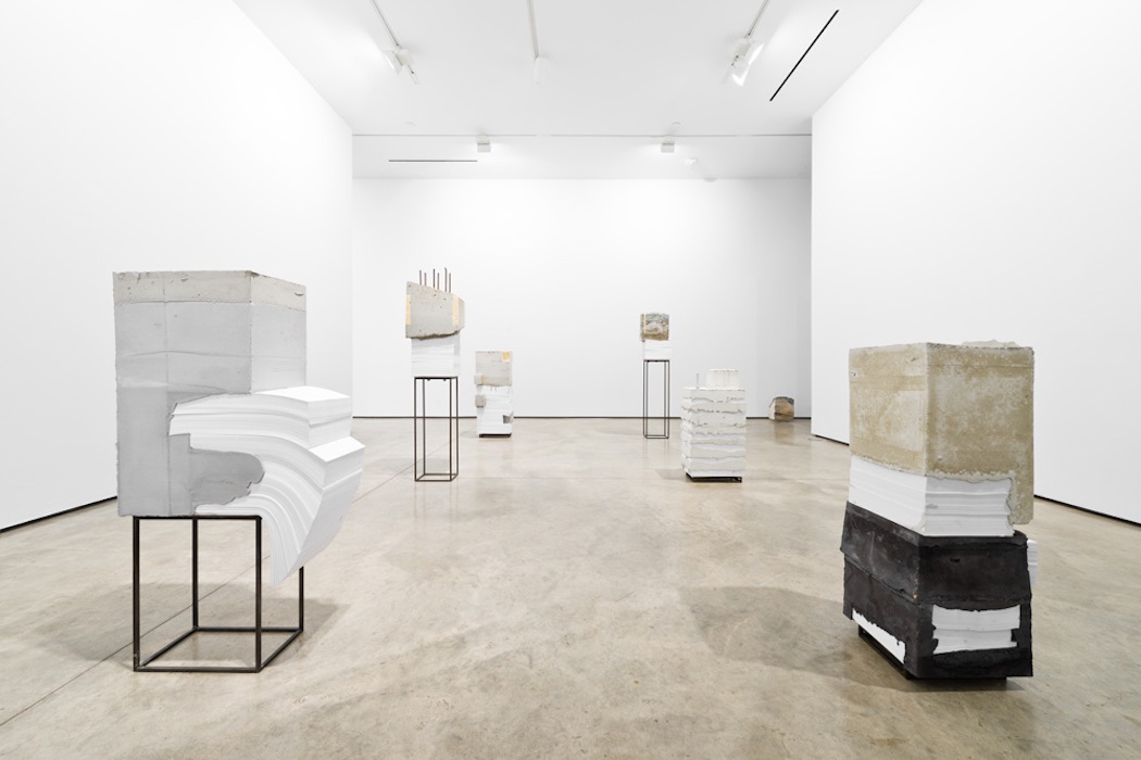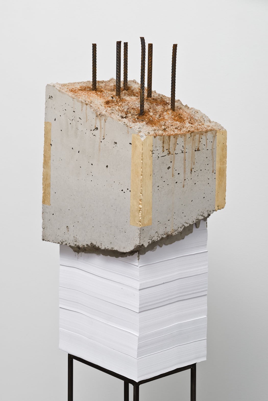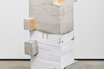 Titled “White Lies”, this new series of artist Lucas Simões comprises six column-like sculptures made from concrete and paper piles. Simões is presenting his new pieces at Lora Reynolds Gallery arranged in a grid, as if they were pylons for an imaginary building during a construction process. Inspired by Brutalist architecture, these freestanding sculptures combine geometric shapes cast in concrete, stacked on top of hundreds of sheets of paper or pinched between the forms without internal supports or glue, only gravity holds the sculptures together. Paper and concrete seem to cascade toward the ground or climb skyward in a regular pattern, freezing the moment before each pillar topples. Simões’s series is about buildings, their stability and failure, and the consequences of their existence. The idiom of White Lies implies a certain harmlessness. But instead thinking about the phrase in terms of race, it encourages a reconsideration of modern architecture, the people at its helm, and its effects on the world.