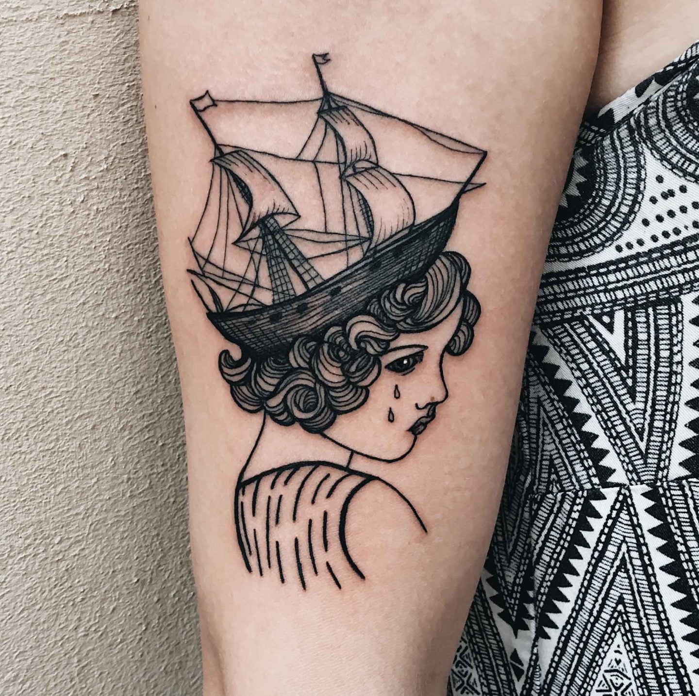 Simone: This time, the tattoo is based on a line from a song that another client told me about. It goes something like, ‘In human nature, we should be aware that we’re always an organ and a blade.’ Personally, I interpreted it as we’re never just a victim but also someone who hurts. There’s always both sides to it. Around this time, I found an interesting visual of the anatomy of a fish and wanted to do something with it. So when you first look at the tattoo design, it looks like a girl holding a speargun. But if you look closer, you realize that her insides are made of a fish that blends into the drapery of her clothing—and the speargun is turned towards herself. There’s also a triangle composition, resembling something that’s cyclical. After I finished the design, I sent it to some customers that I tattoo quite often and thought might be interested in it.