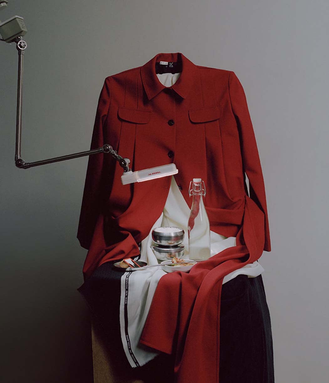 For the J.Kim FW 17 collection, Jenia Kim created a series named ‘Still Lifes’ in collaboration with director Gina Onegina and photographer Eugene Shishkin. The collection features clean lines and soft materials in this season’s indispensable red colour tones and check patterns. The “Still Lifes” images show the collection’s key pieces displayed on a chair. Jenia Kim’s Korean roots are not reflected in her designs, but rather in typically Korean meals, positioned on her clothes. From rice to Kimchi and flowers, all of Kim’s favourite Korean food is put into context with her contemporary fashion design. This series focuses on the designer’s roots, presenting contemporary fashion while giving an opportunity to get acquainted with the rich Korean culture.