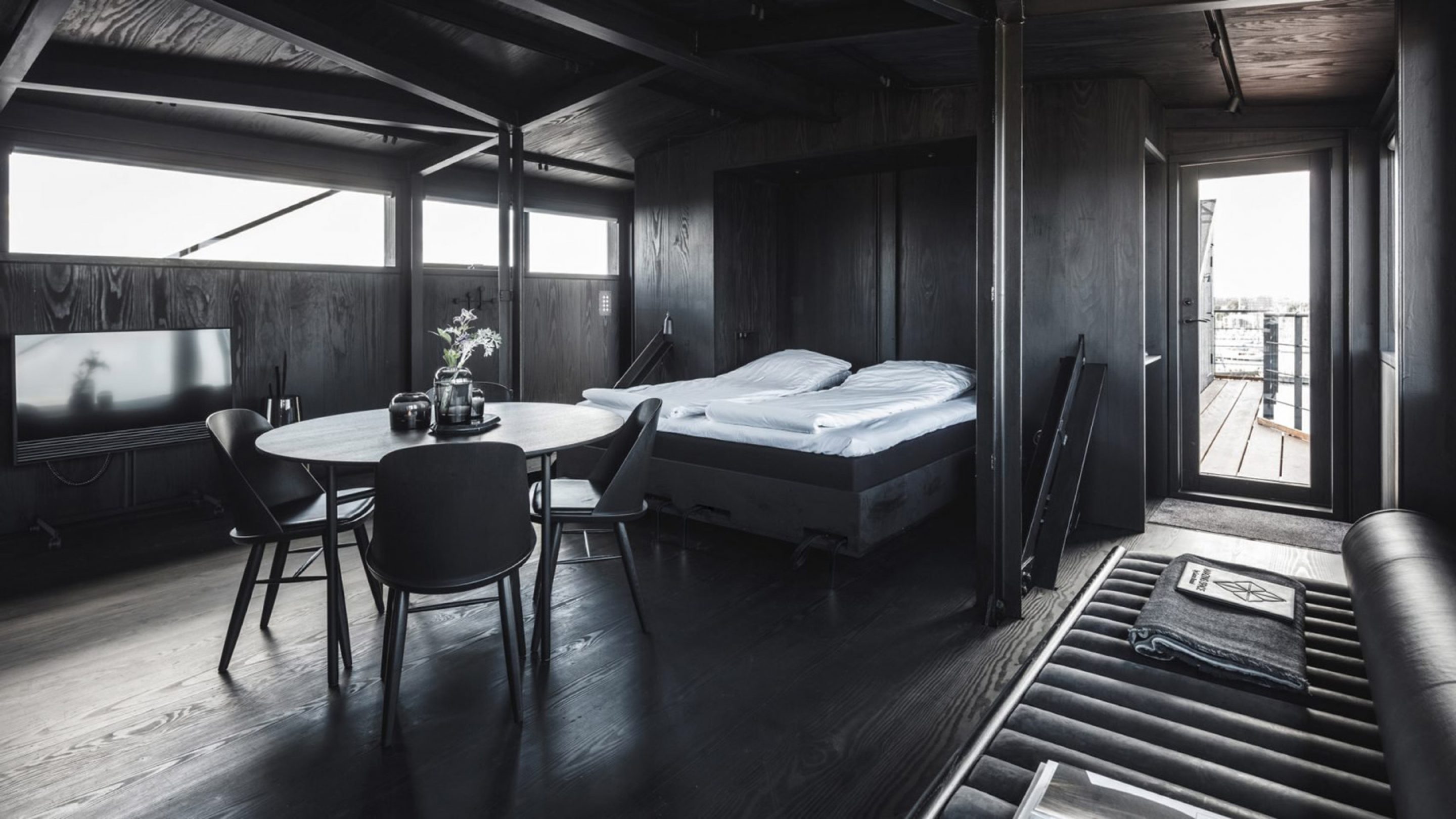 The Krane consists of ‘The Krane Room Sleep,’ the intimate hotel room for two; ‘The Krane Room Meet’, the meeting space at the edge of the water; ‘The Glass Box Meet’, the meeting room offering 360° panoramic views and ‘The Amazing Krane Spa’. To pay homage to the history of the crane, the interior boasts a predominantly black color scheme. Kastbjerg explains this decision in more depth, “Usually you go to a hotel and a thousand things are happening. You’re at the hotel to de-stress from work but now you have to de-stress from the hotel. With The Krane, the black interior combined with the crisp white bed sheets makes everything quiet. You can feel calm, at peace. Enjoying the view as the art.” The minimalist aesthetic reflects the Danish design ideology of less-is-more, eliminating unnecessary elements to limit distraction from the magnificent views of the ocean and the city. In contrast to the dark design that envelopes the majority of The Krane’s interior, the spa is clad in stone, with two oversized bathtubs aligned against an immense glass wall, which offers a singular view of the ocean and the harbor. Wood, leather, stone, and steel make up the majority of materials used for the design and décor details. To maintain the minimalist ambiance, the furniture has been custom-made to ensure the pieces can disappear into integrated wall panels.