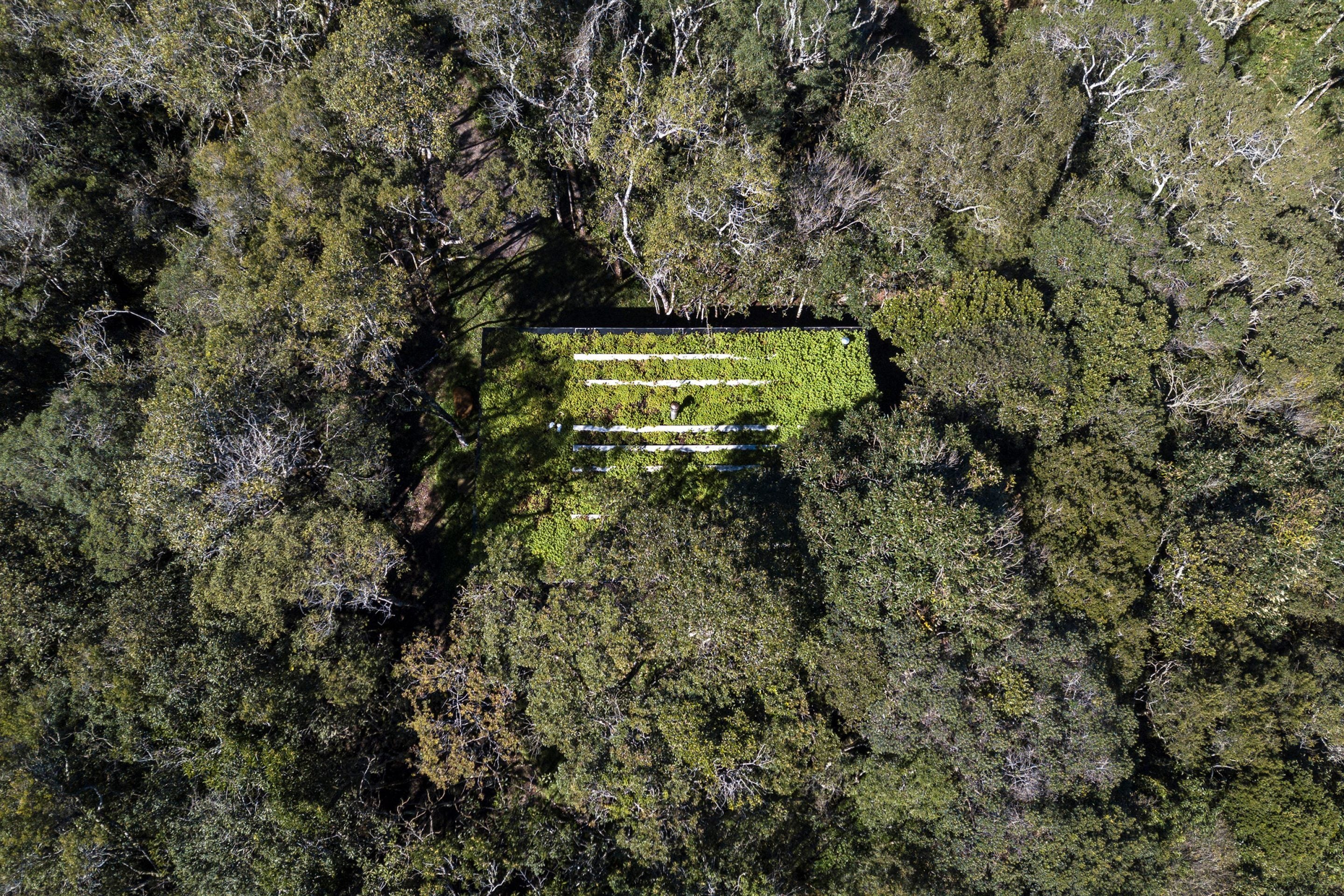 The cabin is the most recent in series of prefabricated residences that MAPA and Minimod have produced together. Like its previous iterations in Uruguay and Brazil, the Curucaca Cabin was built off-site before traveling 900 kilometers from the factory outside of São Paulo to its final destination: a small glade in the Curucaca Valley. Built from cross-laminated timber and raised above the ground on stilts, the compact 90-square-meter cabin was designed to have as little impact on the surrounding environment as possible. The building is centered around a generous living, dining and kitchen area. This social space opens onto the rainforest through large windows and sliding glass doors that lead to two semi-enclosed patio spaces. Bookending the open plan center are two bedrooms of equal size, each with an ensuite. The thoughtfully designed interior has been completed in light wood panels with neutral colored furnishings. The wooden exterior has been painted black and stands topped by a grass roof designed to merge the building with its natural surrounds.