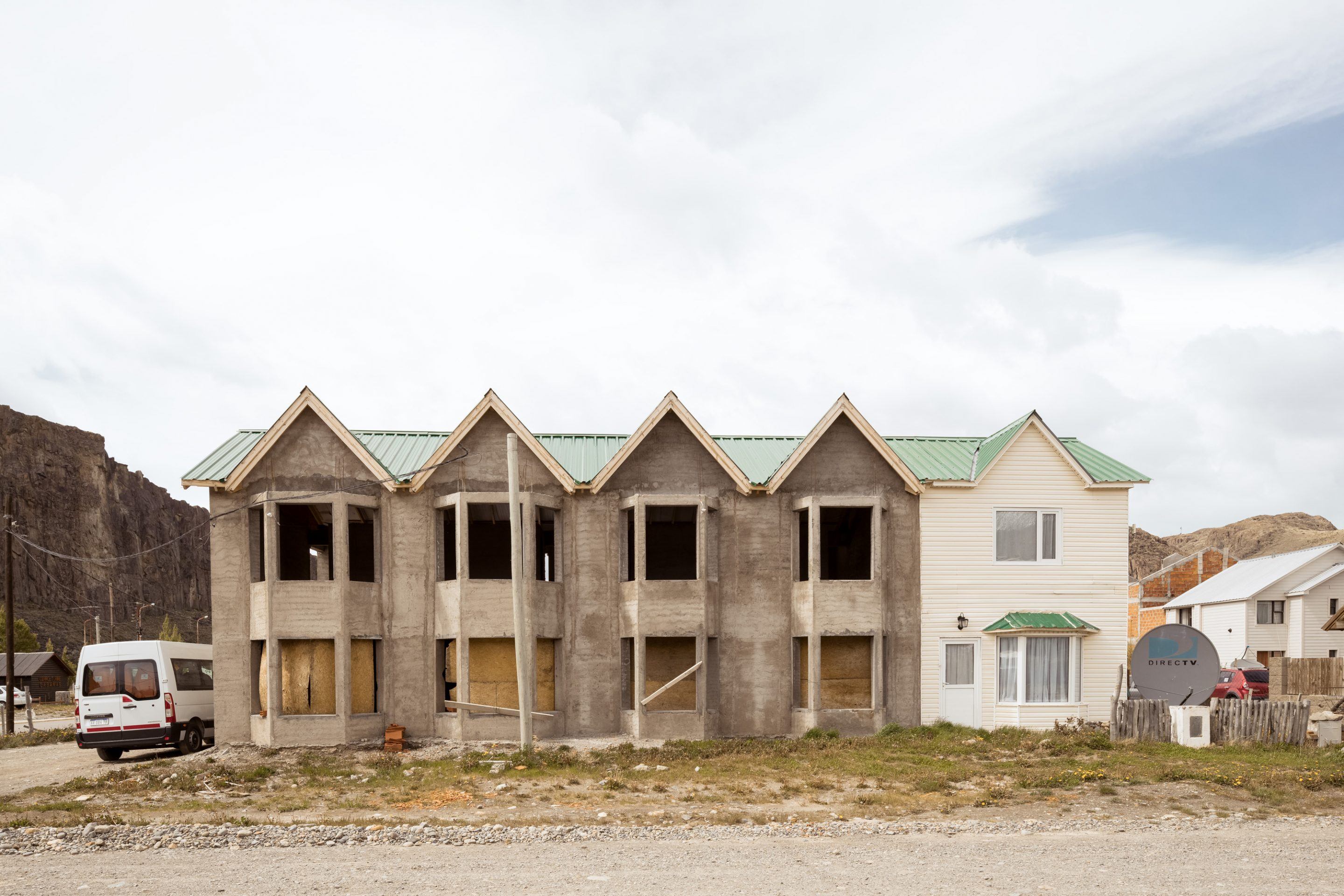 El Chaltén sits at the edge of nowhere, nestled in the dazzling rocky landscapes of southern Patagonia, between Chile and Argentina. With only 400 permanent residents, untouched nature still rules here. Yet, what captured the eye of Poirier is not the natural scenery but the many somewhat eccentric single storey homes along the village’s roads. The concrete and brick structures are topped with metal roofing, making the houses’ architecture indisputably practical. There is a necessity to such an architectural style: protection, first and foremost, from the Patagonian weather. Yet, the houses are also conspicuously loud, and do not merge harmoniously into the surrounding terrain; instead, they stand in dramatic contrast to the country’s topography. Embracing their urban imperfection, they stake their claim to a patch of land and announce, unapologetically, a human presence in an otherwise untamed world.