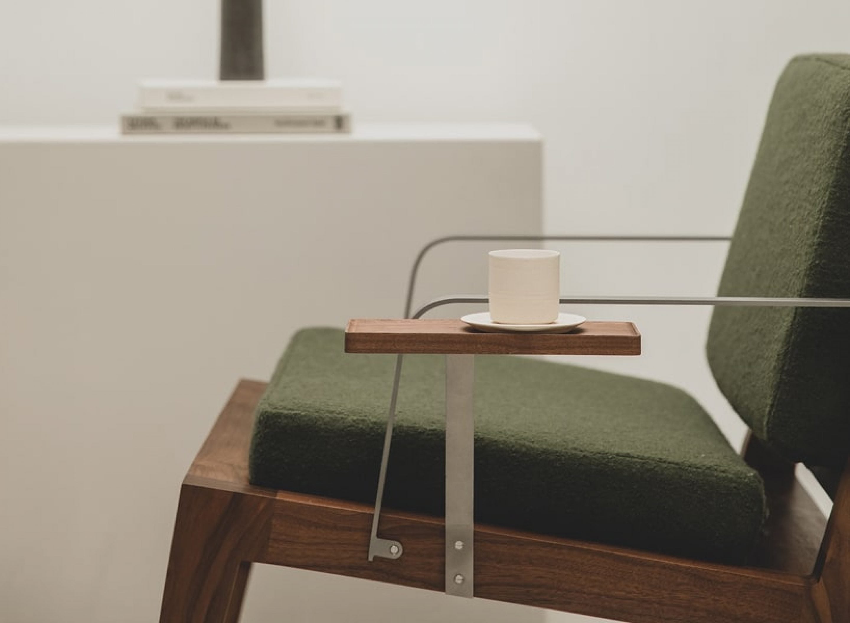 Also featured is the Lounge Chairs, which were built in collaboration with furniture maker Lewis Macleod. Made to order in a highly limited edition, the chair can be specified in either American Walnut or Scottish Oak. Three divergent textiles options are available; grey Melton wool, tan calf leather, or forest green Italian bouclé, the latter of which the studio says evokes the mid-century aesthetic of Charlotte Perriand and Jean Prouvé. “The most striking feature is subtle: a small removable plinth extending on a stainless steel arm, bolted to the left hand side of each chair,” the studio continues. “Its bevelled hardwood top is large enough for a coffee cup or book and neatly adds an additional level of functionality, something which runs through much of our work.”
